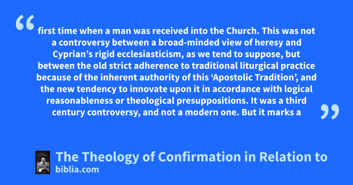 first time when a man was received into the Church. This was not a controversy between a broad-minded view of heresy and Cyprian’s rigid ecclesiasticism, as we tend to suppose, but between the old strict adherence to traditional liturgical practice because of the inherent authority of this ‘Apostolic Tradition’, and the new tendency to innovate upon it in accordance with logical reasonableness or theological presuppositions. It was a third century controversy, and not a modern one. But it marks a