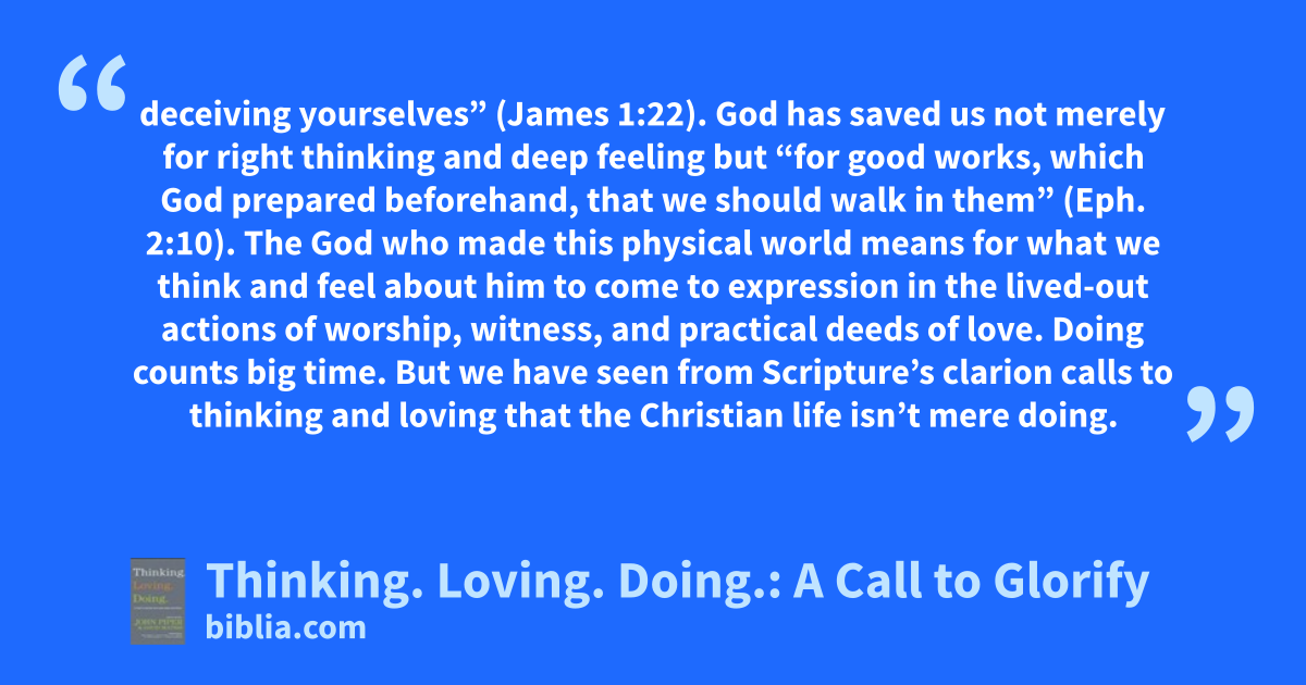 deceiving yourselves” (James 1:22). God has saved us not merely for right thinking and deep feeling but “for good works, which God prepared beforehand, that we should walk in them” (Eph. 2:10). The God who made this physical world means for what we think and feel about him to come to expression in the lived-out actions of worship, witness, and practical deeds of love. Doing counts big time. But we have seen from Scripture’s clarion calls to thinking and loving that the Christian life isn’t mere doing.