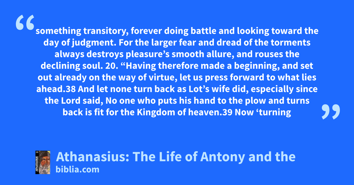 something transitory, forever doing battle and looking toward the day of judgment. For the larger fear and dread of the torments always destroys pleasure’s smooth allure, and rouses the declining soul. 20. “Having therefore made a beginning, and set out already on the way of virtue, let us press forward to what lies ahead.38 And let none turn back as Lot’s wife did, especially since the Lord said, No one who puts his hand to the plow and turns back is fit for the Kingdom of heaven.39 Now ‘turning