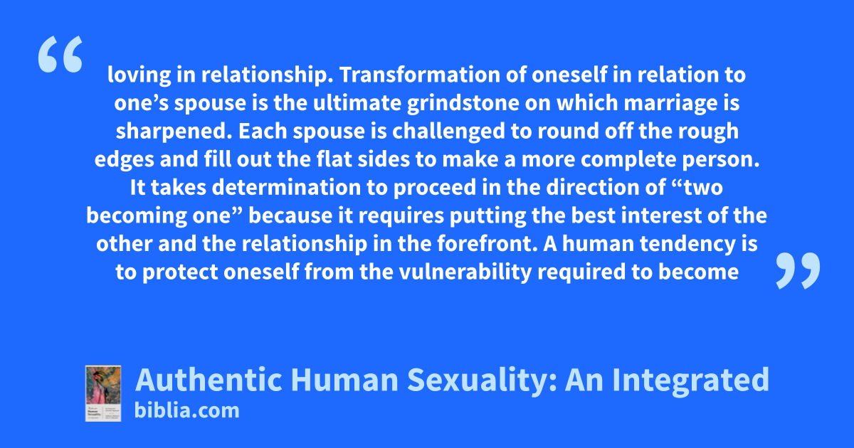 loving in relationship. Transformation of oneself in relation to one’s spouse is the ultimate grindstone on which marriage is sharpened. Each spouse is challenged to round off the rough edges and fill out the flat sides to make a more complete person. It takes determination to proceed in the direction of “two becoming one” because it requires putting the best interest of the other and the relationship in the forefront. A human tendency is to protect oneself from the vulnerability required to become