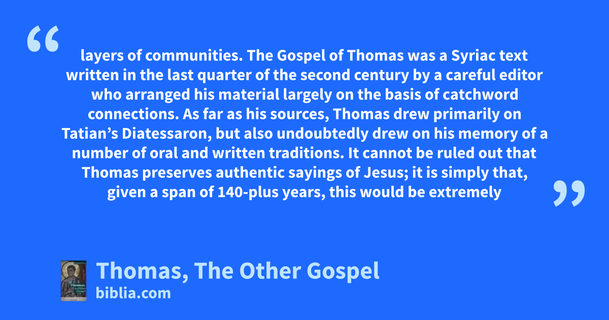 layers of communities. The Gospel of Thomas was a Syriac text written in the last quarter of the second century by a careful editor who arranged his material largely on the basis of catchword connections. As far as his sources, Thomas drew primarily on Tatian’s Diatessaron, but also undoubtedly drew on his memory of a number of oral and written traditions. It cannot be ruled out that Thomas preserves authentic sayings of Jesus; it is simply that, given a span of 140-plus years, this would be extremely