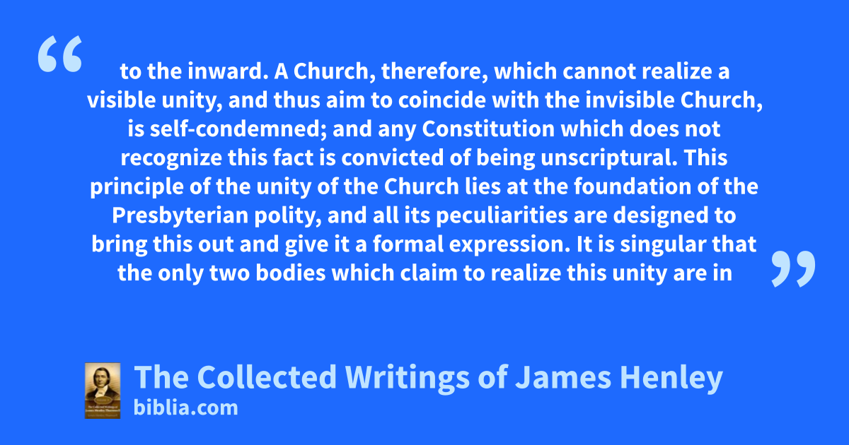 to the inward. A Church, therefore, which cannot realize a visible unity, and thus aim to coincide with the invisible Church, is self-condemned; and any Constitution which does not recognize this fact is convicted of being unscriptural. This principle of the unity of the Church lies at the foundation of the Presbyterian polity, and all its peculiarities are designed to bring this out and give it a formal expression. It is singular that the only two bodies which claim to realize this unity are in