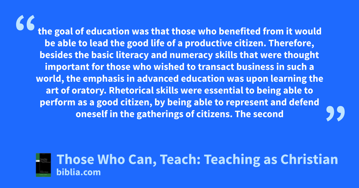 the goal of education was that those who benefited from it would be able to lead the good life of a productive citizen. Therefore, besides the basic literacy and numeracy skills that were thought important for those who wished to transact business in such a world, the emphasis in advanced education was upon learning the art of oratory. Rhetorical skills were essential to being able to perform as a good citizen, by being able to represent and defend oneself in the gatherings of citizens. The second