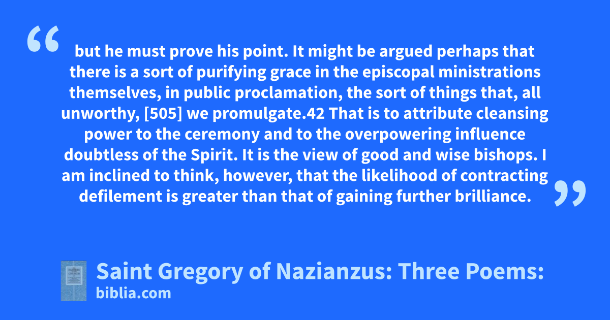 but he must prove his point. It might be argued perhaps that there is a sort of purifying grace in the episcopal ministrations themselves, in public proclamation, the sort of things that, all unworthy, [505] we promulgate.42 That is to attribute cleansing power to the ceremony and to the overpowering influence doubtless of the Spirit. It is the view of good and wise bishops. I am inclined to think, however, that the likelihood of contracting defilement is greater than that of gaining further brilliance.