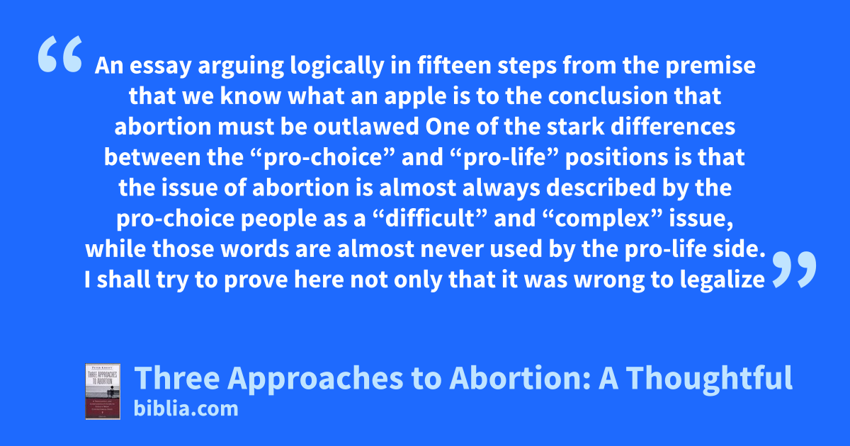 An essay arguing logically in fifteen steps from the premise that we know what an apple is to the conclusion that abortion must be outlawed One of the stark differences between the “pro-choice” and “pro-life” positions is that the issue of abortion is almost always described by the pro-choice people as a “difficult” and “complex” issue, while those words are almost never used by the pro-life side. I shall try to prove here not only that it was wrong to legalize