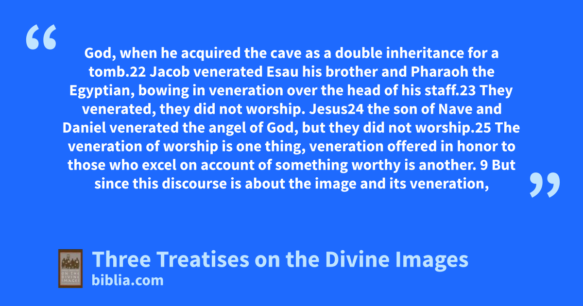 God, when he acquired the cave as a double inheritance for a tomb.22 Jacob venerated Esau his brother and Pharaoh the Egyptian, bowing in veneration over the head of his staff.23 They venerated, they did not worship. Jesus24 the son of Nave and Daniel venerated the angel of God, but they did not worship.25 The veneration of worship is one thing, veneration offered in honor to those who excel on account of something worthy is another. 9 But since this discourse is about the image and its veneration,