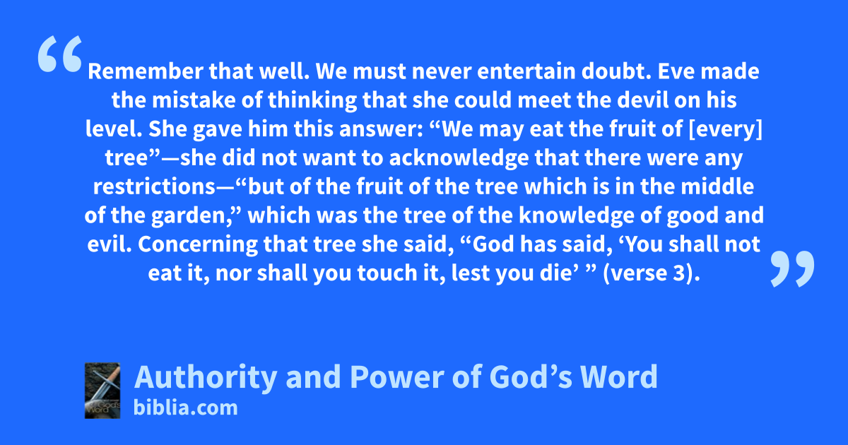 Remember that well. We must never entertain doubt. Eve made the mistake of thinking that she could meet the devil on his level. She gave him this answer: “We may eat the fruit of [every] tree”—she did not want to acknowledge that there were any restrictions—“but of the fruit of the tree which is in the middle of the garden,” which was the tree of the knowledge of good and evil. Concerning that tree she said, “God has said, ‘You shall not eat it, nor shall you touch it, lest you die’ ” (verse 3).