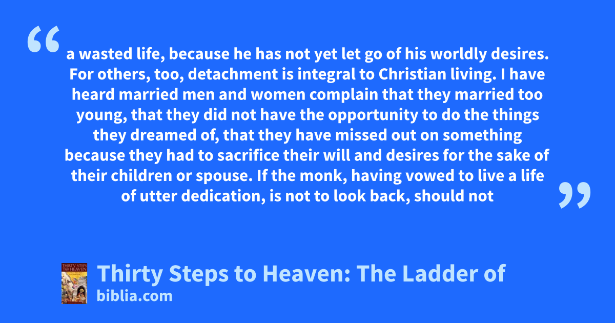 a wasted life, because he has not yet let go of his worldly desires. For others, too, detachment is integral to Christian living. I have heard married men and women complain that they married too young, that they did not have the opportunity to do the things they dreamed of, that they have missed out on something because they had to sacrifice their will and desires for the sake of their children or spouse. If the monk, having vowed to live a life of utter dedication, is not to look back, should not