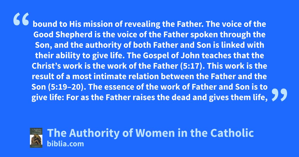 bound to His mission of revealing the Father. The voice of the Good Shepherd is the voice of the Father spoken through the Son, and the authority of both Father and Son is linked with their ability to give life. The Gospel of John teaches that the Christ’s work is the work of the Father (5:17). This work is the result of a most intimate relation between the Father and the Son (5:19–20). The essence of the work of Father and Son is to give life: For as the Father raises the dead and gives them life,