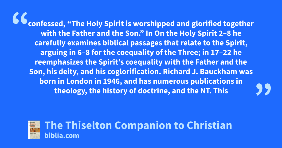 confessed, “The Holy Spirit is worshipped and glorified together with the Father and the Son.” In On the Holy Spirit 2–8 he carefully examines biblical passages that relate to the Spirit, arguing in 6–8 for the coequality of the Three; in 17–22 he reemphasizes the Spirit’s coequality with the Father and the Son, his deity, and his coglorification. Richard J. Bauckham was born in London in 1946, and has numerous publications in theology, the history of doctrine, and the NT. This