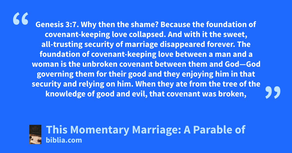 Genesis 3:7. Why then the shame? Because the foundation of covenant-keeping love collapsed. And with it the sweet, all-trusting security of marriage disappeared forever. The foundation of covenant-keeping love between a man and a woman is the unbroken covenant between them and God—God governing them for their good and they enjoying him in that security and relying on him. When they ate from the tree of the knowledge of good and evil, that covenant was broken,