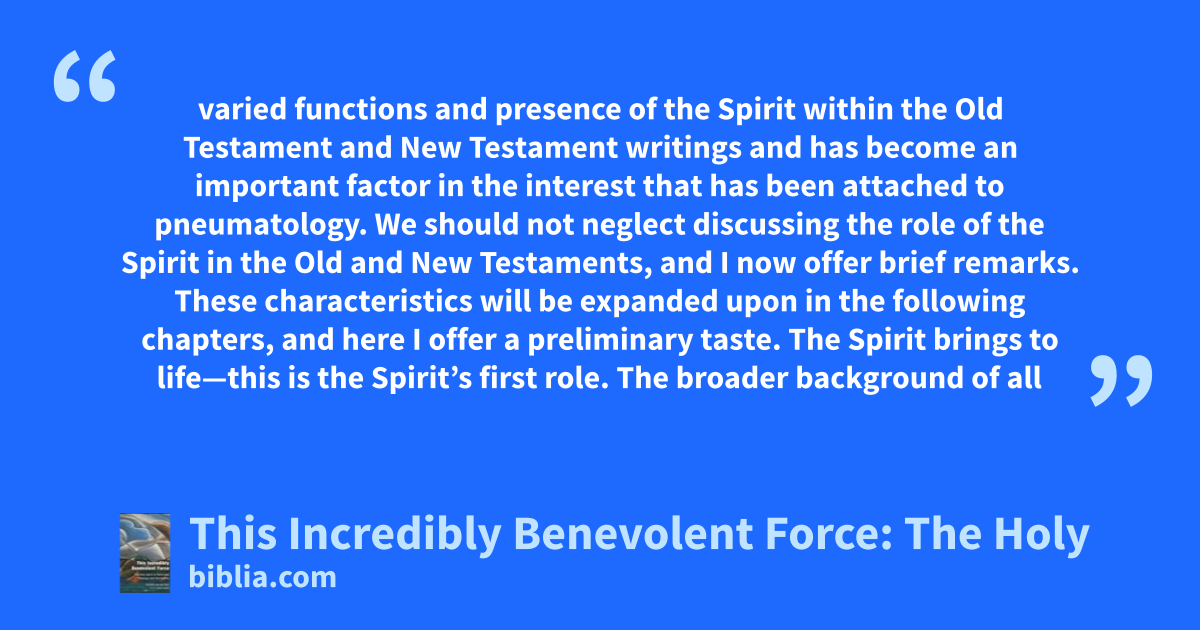 varied functions and presence of the Spirit within the Old Testament and New Testament writings and has become an important factor in the interest that has been attached to pneumatology. We should not neglect discussing the role of the Spirit in the Old and New Testaments, and I now offer brief remarks. These characteristics will be expanded upon in the following chapters, and here I offer a preliminary taste. The Spirit brings to life—this is the Spirit’s first role. The broader background of all