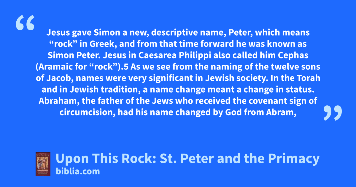 Jesus gave Simon a new, descriptive name, Peter, which means “rock” in Greek, and from that time forward he was known as Simon Peter. Jesus in Caesarea Philippi also called him Cephas (Aramaic for “rock”).5 As we see from the naming of the twelve sons of Jacob, names were very significant in Jewish society. In the Torah and in Jewish tradition, a name change meant a change in status. Abraham, the father of the Jews who received the covenant sign of circumcision, had his name changed by God from Abram,