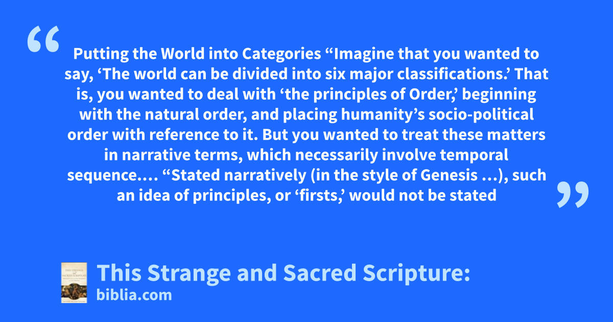 Putting the World into Categories “Imagine that you wanted to say, ‘The world can be divided into six major classifications.’ That is, you wanted to deal with ‘the principles of Order,’ beginning with the natural order, and placing humanity’s socio-political order with reference to it. But you wanted to treat these matters in narrative terms, which necessarily involve temporal sequence.… “Stated narratively (in the style of Genesis …), such an idea of principles, or ‘firsts,’ would not be stated