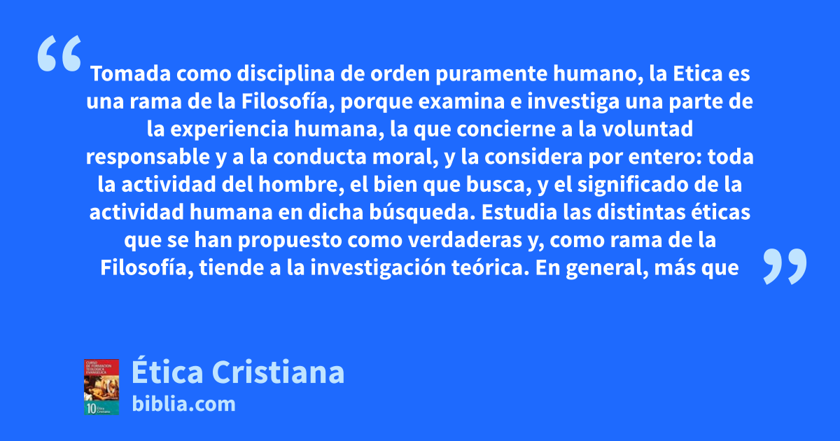 Tomada como disciplina de orden puramente humano, la Etica es una rama de la Filosofía, porque examina e investiga una parte de la experiencia humana, la que concierne a la voluntad responsable y a la conducta moral, y la considera por entero: toda la actividad del hombre, el bien que busca, y el significado de la actividad humana en dicha búsqueda. Estudia las distintas éticas que se han propuesto como verdaderas y, como rama de la Filosofía, tiende a la investigación teórica. En general, más que