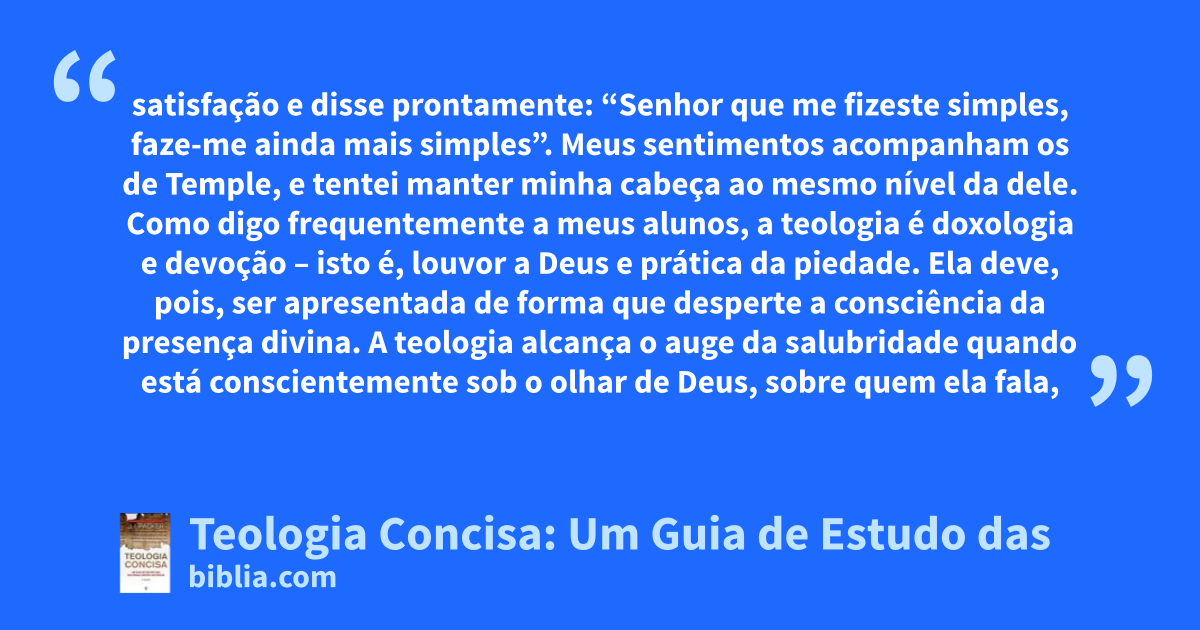 satisfação e disse prontamente: “Senhor que me fizeste simples, faze-me ainda mais simples”. Meus sentimentos acompanham os de Temple, e tentei manter minha cabeça ao mesmo nível da dele. Como digo frequentemente a meus alunos, a teologia é doxologia e devoção – isto é, louvor a Deus e prática da piedade. Ela deve, pois, ser apresentada de forma que desperte a consciência da presença divina. A teologia alcança o auge da salubridade quando está conscientemente sob o olhar de Deus, sobre quem ela fala,