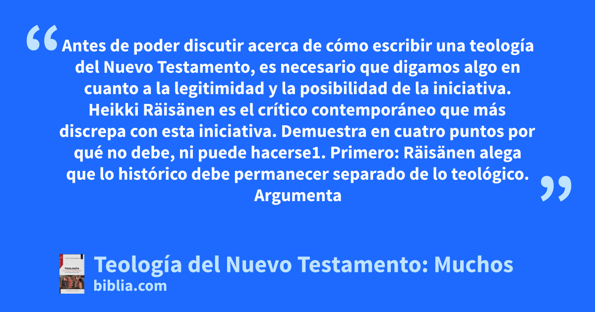 Antes de poder discutir acerca de cómo escribir una teología del Nuevo Testamento, es necesario que digamos algo en cuanto a la legitimidad y la posibilidad de la iniciativa. Heikki Räisänen es el crítico contemporáneo que más discrepa con esta iniciativa. Demuestra en cuatro puntos por qué no debe, ni puede hacerse1. Primero: Räisänen alega que lo histórico debe permanecer separado de lo teológico. Argumenta