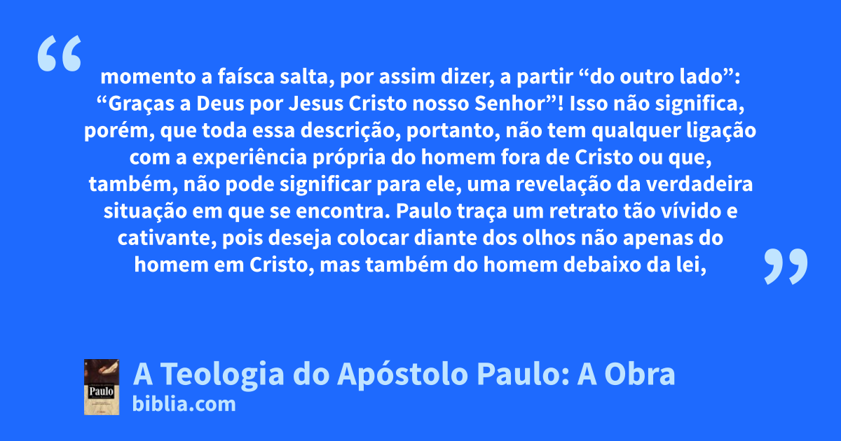 momento a faísca salta, por assim dizer, a partir “do outro lado”: “Graças a Deus por Jesus Cristo nosso Senhor”! Isso não significa, porém, que toda essa descrição, portanto, não tem qualquer ligação com a experiência própria do homem fora de Cristo ou que, também, não pode significar para ele, uma revelação da verdadeira situação em que se encontra. Paulo traça um retrato tão vívido e cativante, pois deseja colocar diante dos olhos não apenas do homem em Cristo, mas também do homem debaixo da lei,