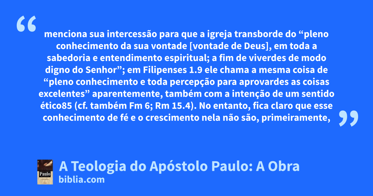 menciona sua intercessão para que a igreja transborde do “pleno conhecimento da sua vontade [vontade de Deus], em toda a sabedoria e entendimento espiritual; a fim de viverdes de modo digno do Senhor”; em Filipenses 1.9 ele chama a mesma coisa de “pleno conhecimento e toda percepção para aprovardes as coisas excelentes” aparentemente, também com a intenção de um sentido ético85 (cf. também Fm 6; Rm 15.4). No entanto, fica claro que esse conhecimento de fé e o crescimento nela não são, primeiramente,
