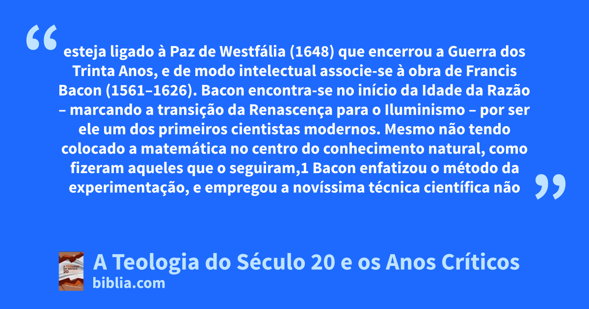 esteja ligado à Paz de Westfália (1648) que encerrou a Guerra dos Trinta Anos, e de modo intelectual associe-se à obra de Francis Bacon (1561–1626). Bacon encontra-se no início da Idade da Razão – marcando a transição da Renascença para o Iluminismo – por ser ele um dos primeiros cientistas modernos. Mesmo não tendo colocado a matemática no centro do conhecimento natural, como fizeram aqueles que o seguiram,1 Bacon enfatizou o método da experimentação, e empregou a novíssima técnica científica não