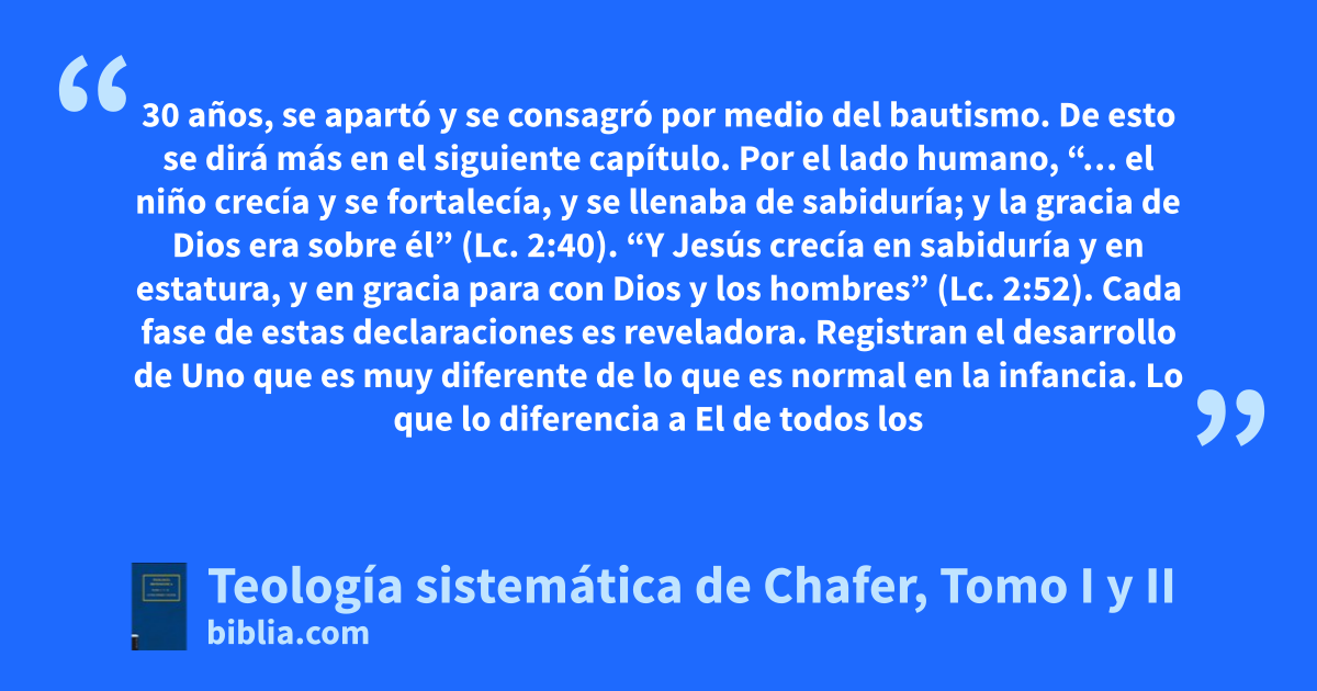 30 años, se apartó y se consagró por medio del bautismo. De esto se dirá más en el siguiente capítulo. Por el lado humano, “… el niño crecía y se fortalecía, y se llenaba de sabiduría; y la gracia de Dios era sobre él” (Lc. 2:40). “Y Jesús crecía en sabiduría y en estatura, y en gracia para con Dios y los hombres” (Lc. 2:52). Cada fase de estas declaraciones es reveladora. Registran el desarrollo de Uno que es muy diferente de lo que es normal en la infancia. Lo que lo diferencia a El de todos los
