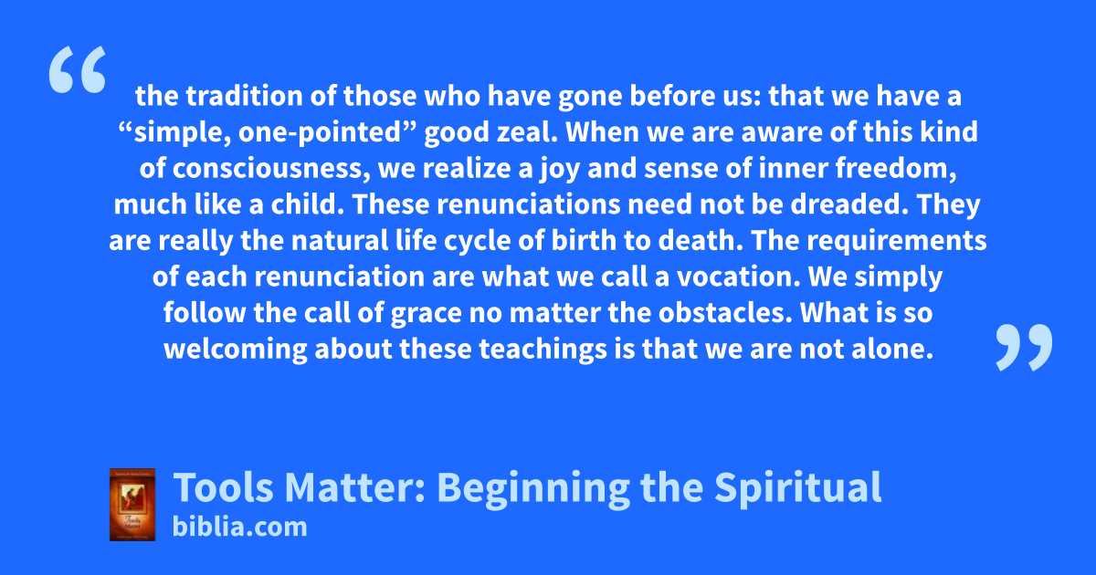 the tradition of those who have gone before us: that we have a “simple, one-pointed” good zeal. When we are aware of this kind of consciousness, we realize a joy and sense of inner freedom, much like a child. These renunciations need not be dreaded. They are really the natural life cycle of birth to death. The requirements of each renunciation are what we call a vocation. We simply follow the call of grace no matter the obstacles. What is so welcoming about these teachings is that we are not alone.