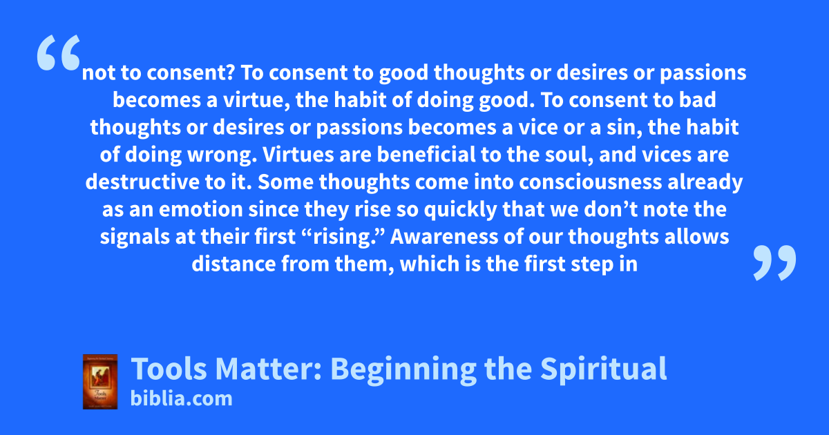 not to consent? To consent to good thoughts or desires or passions becomes a virtue, the habit of doing good. To consent to bad thoughts or desires or passions becomes a vice or a sin, the habit of doing wrong. Virtues are beneficial to the soul, and vices are destructive to it. Some thoughts come into consciousness already as an emotion since they rise so quickly that we don’t note the signals at their first “rising.” Awareness of our thoughts allows distance from them, which is the first step in
