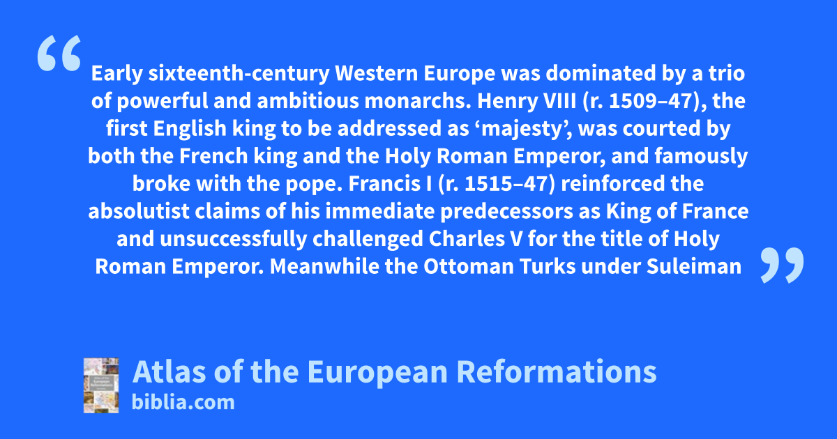 Early sixteenth-century Western Europe was dominated by a trio of powerful and ambitious monarchs. Henry VIII (r. 1509–47), the first English king to be addressed as ‘majesty’, was courted by both the French king and the Holy Roman Emperor, and famously broke with the pope. Francis I (r. 1515–47) reinforced the absolutist claims of his immediate predecessors as King of France and unsuccessfully challenged Charles V for the title of Holy Roman Emperor. Meanwhile the Ottoman Turks under Suleiman