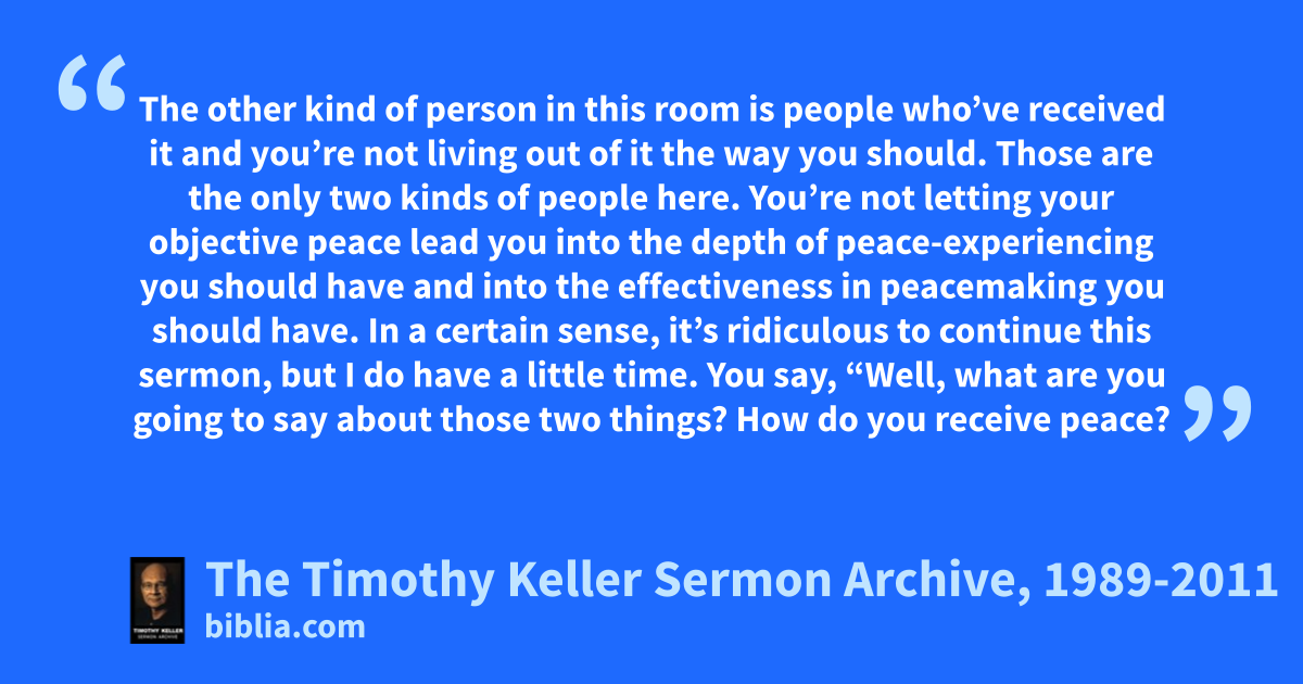 The other kind of person in this room is people who’ve received it and you’re not living out of it the way you should. Those are the only two kinds of people here. You’re not letting your objective peace lead you into the depth of peace-experiencing you should have and into the effectiveness in peacemaking you should have. In a certain sense, it’s ridiculous to continue this sermon, but I do have a little time. You say, “Well, what are you going to say about those two things? How do you receive peace?