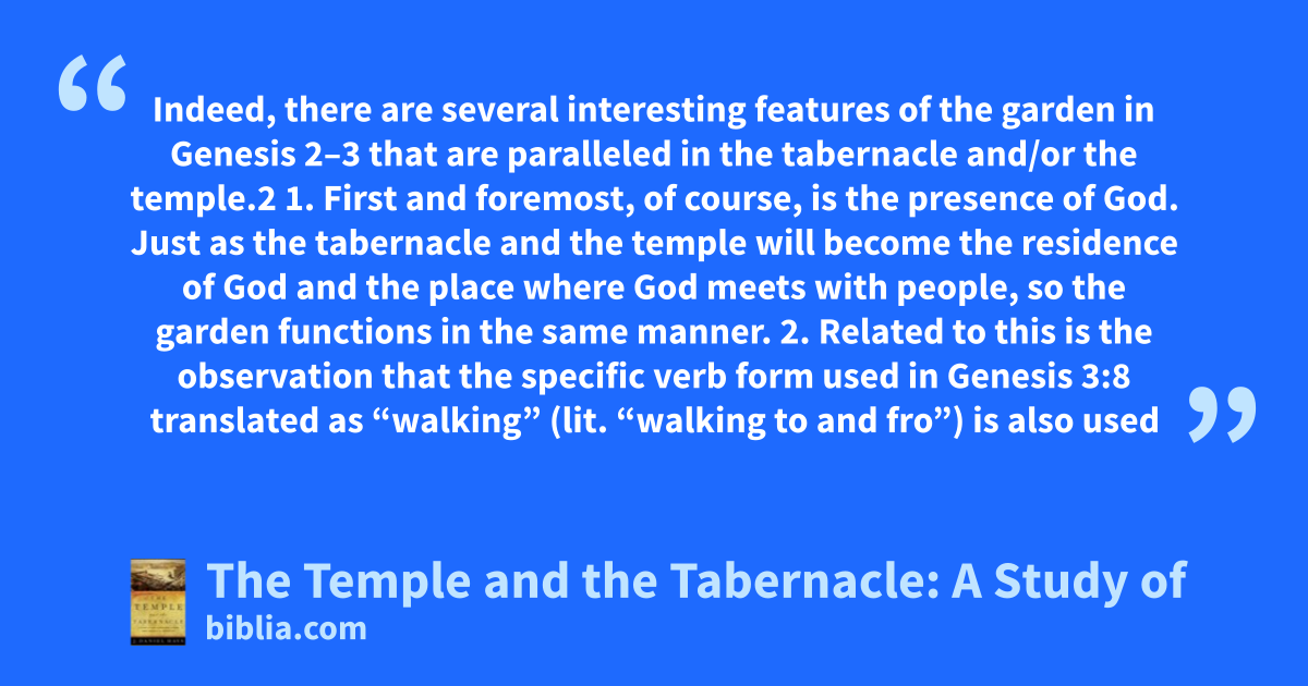 Indeed, there are several interesting features of the garden in Genesis 2–3 that are paralleled in the tabernacle and/or the temple.2 1. First and foremost, of course, is the presence of God. Just as the tabernacle and the temple will become the residence of God and the place where God meets with people, so the garden functions in the same manner. 2. Related to this is the observation that the specific verb form used in Genesis 3:8 translated as “walking” (lit. “walking to and fro”) is also used