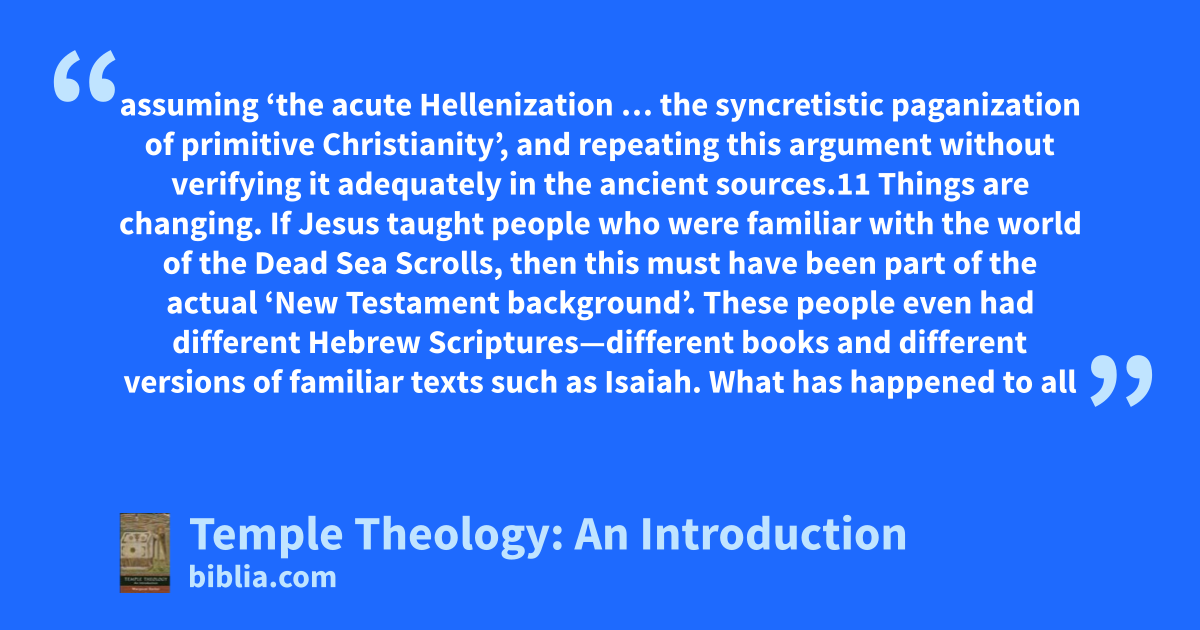 assuming ‘the acute Hellenization … the syncretistic paganization of primitive Christianity’, and repeating this argument without verifying it adequately in the ancient sources.11 Things are changing. If Jesus taught people who were familiar with the world of the Dead Sea Scrolls, then this must have been part of the actual ‘New Testament background’. These people even had different Hebrew Scriptures—different books and different versions of familiar texts such as Isaiah. What has happened to all