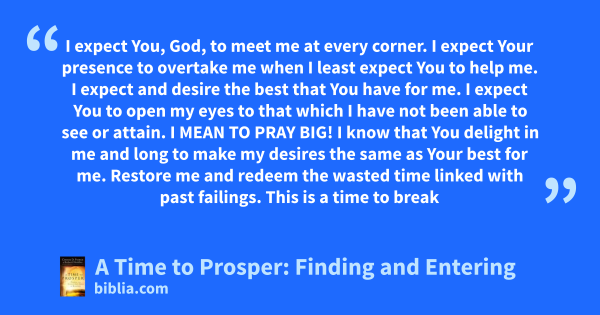 I expect You, God, to meet me at every corner. I expect Your presence to overtake me when I least expect You to help me. I expect and desire the best that You have for me. I expect You to open my eyes to that which I have not been able to see or attain. I MEAN TO PRAY BIG! I know that You delight in me and long to make my desires the same as Your best for me. Restore me and redeem the wasted time linked with past failings. This is a time to break