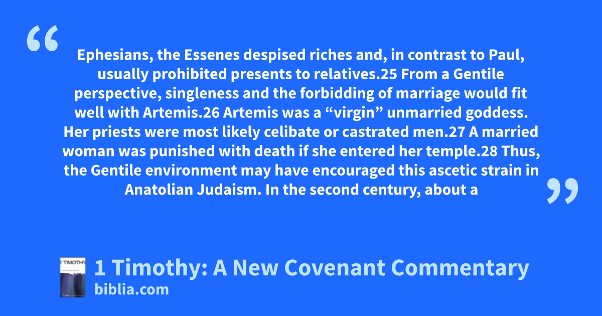 Ephesians, the Essenes despised riches and, in contrast to Paul, usually prohibited presents to relatives.25 From a Gentile perspective, singleness and the forbidding of marriage would fit well with Artemis.26 Artemis was a “virgin” unmarried goddess. Her priests were most likely celibate or castrated men.27 A married woman was punished with death if she entered her temple.28 Thus, the Gentile environment may have encouraged this ascetic strain in Anatolian Judaism. In the second century, about a