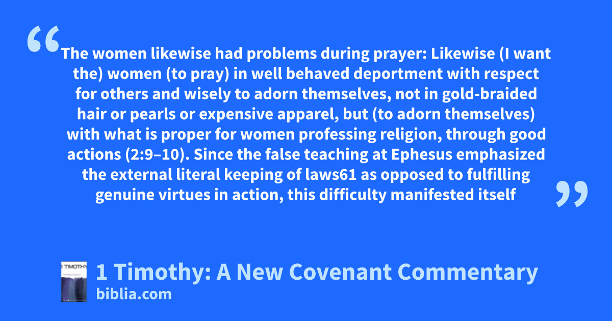 The women likewise had problems during prayer: Likewise (I want the) women (to pray) in well behaved deportment with respect for others and wisely to adorn themselves, not in gold-braided hair or pearls or expensive apparel, but (to adorn themselves) with what is proper for women professing religion, through good actions (2:9–10). Since the false teaching at Ephesus emphasized the external literal keeping of laws61 as opposed to fulfilling genuine virtues in action, this difficulty manifested itself