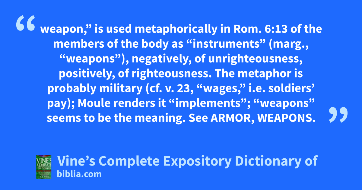 weapon,” is used metaphorically in Rom. 6:13 of the members of the body as “instruments” (marg., “weapons”), negatively, of unrighteousness, positively, of righteousness. The metaphor is probably military (cf. v. 23, “wages,” i.e. soldiers’ pay); Moule renders it “implements”; “weapons” seems to be the meaning. See ARMOR, WEAPONS.