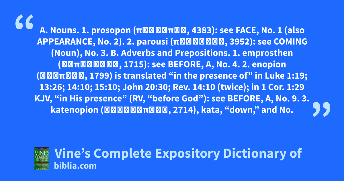 A. Nouns. 1. prosopon (πρόσωπον, 4383): see FACE, No. 1 (also APPEARANCE, No. 2). 2. parousi (παρουσία, 3952): see COMING (Noun), No. 3. B. Adverbs and Prepositions. 1. emprosthen (ἔμπροσθεν, 1715): see BEFORE, A, No. 4. 2. enopion (ἐνώπιον, 1799) is translated “in the presence of” in Luke 1:19; 13:26; 14:10; 15:10; John 20:30; Rev. 14:10 (twice); in 1 Cor. 1:29 KJV, “in His presence” (RV, “before God”): see BEFORE, A, No. 9. 3. katenopion (κατενώπιον, 2714), kata, “down,” and No.