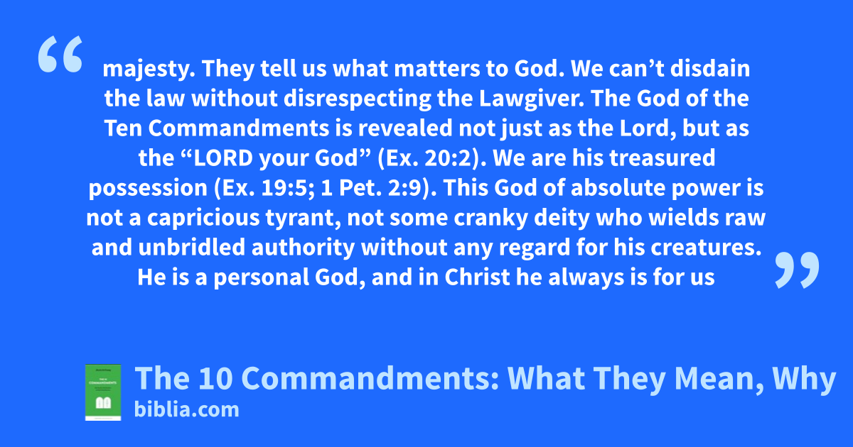 majesty. They tell us what matters to God. We can’t disdain the law without disrespecting the Lawgiver. The God of the Ten Commandments is revealed not just as the Lord, but as the “LORD your God” (Ex. 20:2). We are his treasured possession (Ex. 19:5; 1 Pet. 2:9). This God of absolute power is not a capricious tyrant, not some cranky deity who wields raw and unbridled authority without any regard for his creatures. He is a personal God, and in Christ he always is for us