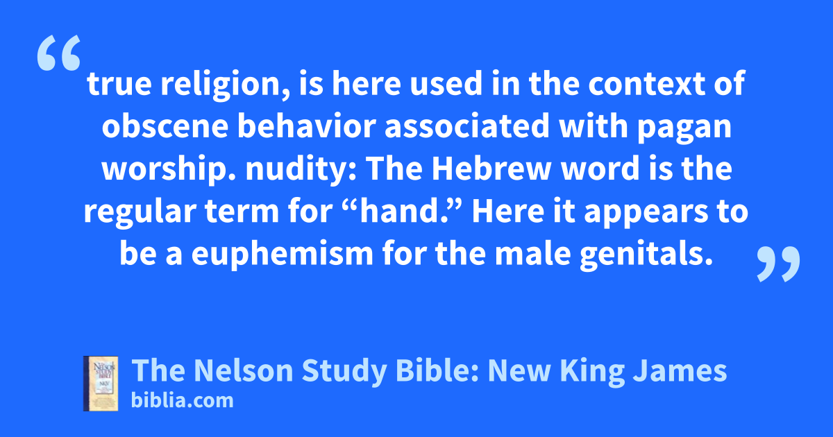 true religion, is here used in the context of obscene behavior associated with pagan worship. nudity: The Hebrew word is the regular term for “hand.” Here it appears to be a euphemism for the male genitals.