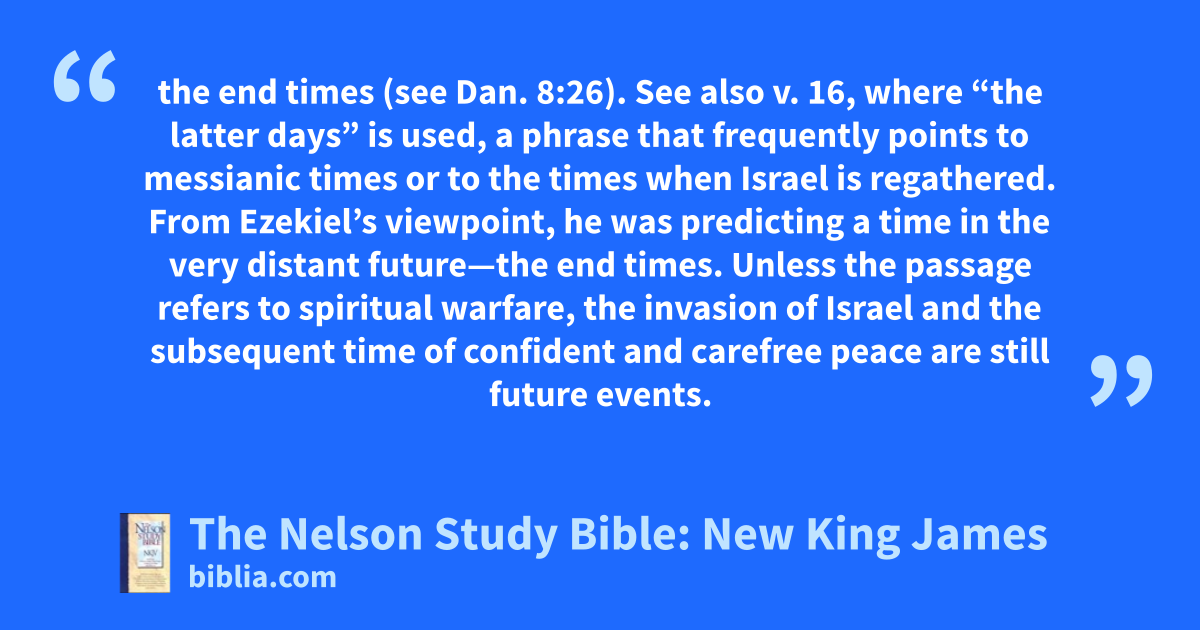 the end times (see Dan. 8:26). See also v. 16, where “the latter days” is used, a phrase that frequently points to messianic times or to the times when Israel is regathered. From Ezekiel’s viewpoint, he was predicting a time in the very distant future—the end times. Unless the passage refers to spiritual warfare, the invasion of Israel and the subsequent time of confident and carefree peace are still future events.