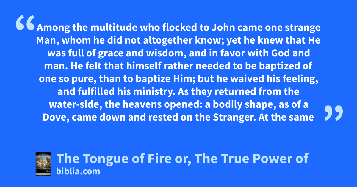 Among the multitude who flocked to John came one strange Man, whom he did not altogether know; yet he knew that He was full of grace and wisdom, and in favor with God and man. He felt that himself rather needed to be baptized of one so pure, than to baptize Him; but he waived his feeling, and fulfilled his ministry. As they returned from the water-side, the heavens opened: a bodily shape, as of a Dove, came down and rested on the Stranger. At the same