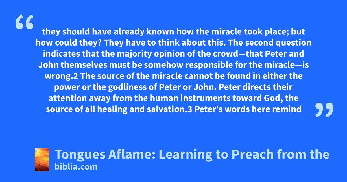 they should have already known how the miracle took place; but how could they? They have to think about this. The second question indicates that the majority opinion of the crowd—that Peter and John themselves must be somehow responsible for the miracle—is wrong.2 The source of the miracle cannot be found in either the power or the godliness of Peter or John. Peter directs their attention away from the human instruments toward God, the source of all healing and salvation.3 Peter’s words here remind
