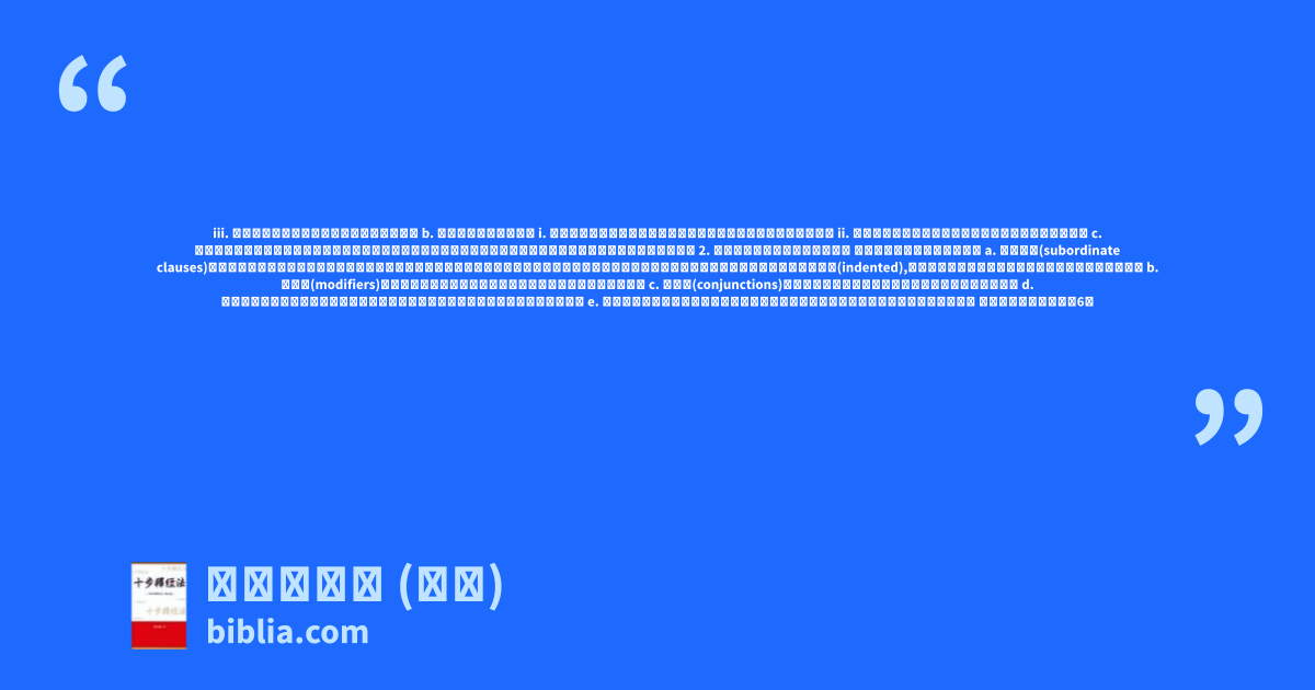 iii. 它是其他經文試圖要配合建立的關鍵句子。 b. 找出主題句子的方法: i. 有些主題句子十分容易辨認出來,往往就是段落開始的第一句話。 ii. 另外有些主題句子會出現在段落的中間或結束的地方。 c. 主題句子可用直述式、命令式或問答式的句子出現,排列經句者須把它放置在紙上的最左方(參下文例一與例二)。 2. 注意其他句子與主題句子的關係 排列經句者須注意以下各點: a. 附屬子句(subordinate clauses)。附屬子句不能單獨存在,它們是用來形容或補充別的句子的意義,它應當放在所屬句子的上面或下面(按它們出現的次序而定),向右縮進一點(indented),在句子的結束處可將它與所屬句子的邏輯關係寫出來。 b. 修飾詞(modifiers)。較長或多於一項的修飾詞與附屬子句相仿,處理方法同上。 c. 連接詞(conjunctions)。連接詞如「和」、「但是」等可放在紙上的最右方。 d. 一連串的名稱、性質或行動等,都可以在同一個位置直排下來,使之更爲明顯可見。 e. 若要使詞句彼此的關係與結構更清晰,而須挪移某詞句,可用「⋯⋯」置於句中表示。 例一:將腓立比書四章6至