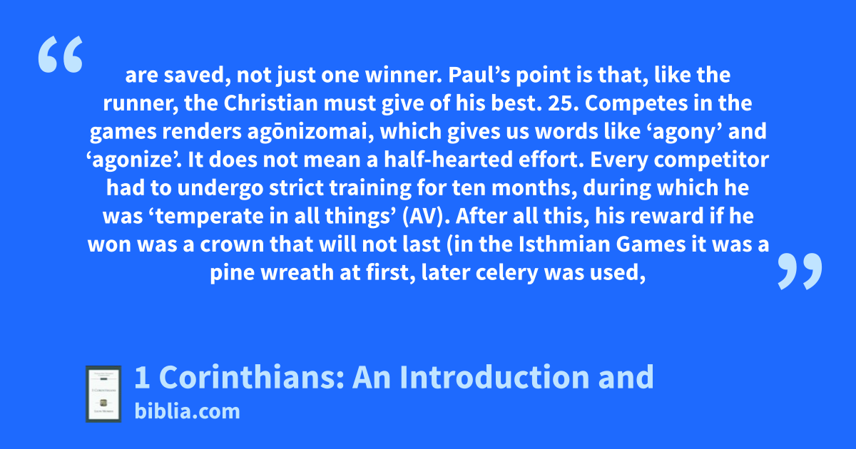 are saved, not just one winner. Paul’s point is that, like the runner, the Christian must give of his best. 25. Competes in the games renders agōnizomai, which gives us words like ‘agony’ and ‘agonize’. It does not mean a half-hearted effort. Every competitor had to undergo strict training for ten months, during which he was ‘temperate in all things’ (AV). After all this, his reward if he won was a crown that will not last (in the Isthmian Games it was a pine wreath at first, later celery was used,