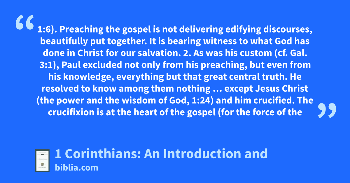 1:6). Preaching the gospel is not delivering edifying discourses, beautifully put together. It is bearing witness to what God has done in Christ for our salvation. 2. As was his custom (cf. Gal. 3:1), Paul excluded not only from his preaching, but even from his knowledge, everything but that great central truth. He resolved to know among them nothing … except Jesus Christ (the power and the wisdom of God, 1:24) and him crucified. The crucifixion is at the heart of the gospel (for the force of the