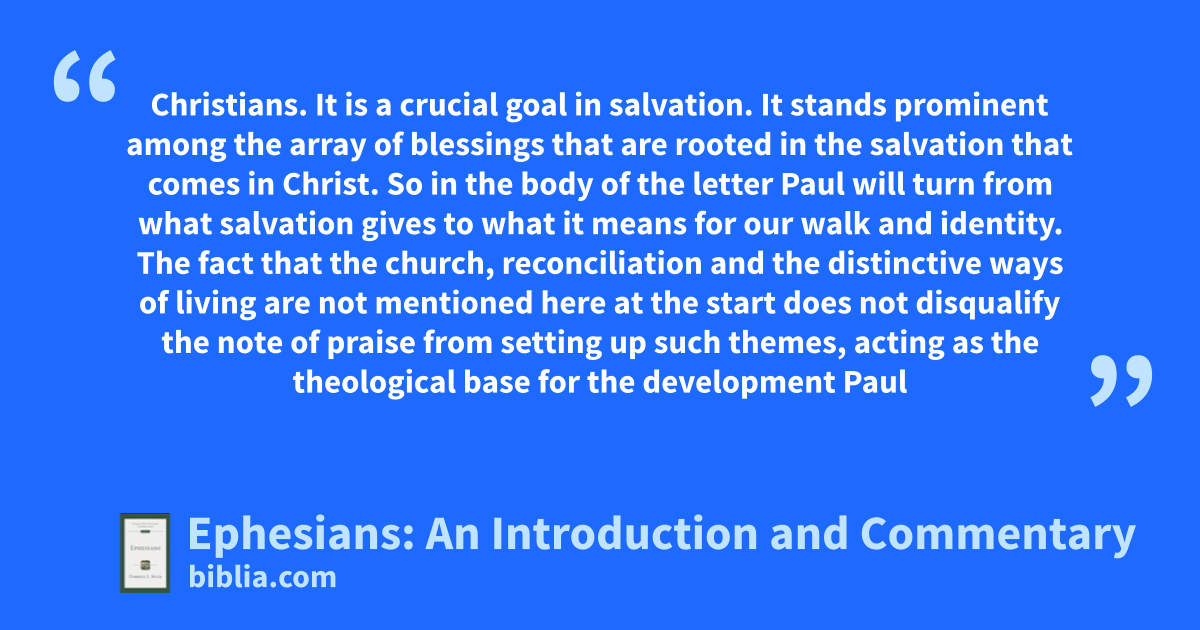 Christians. It is a crucial goal in salvation. It stands prominent among the array of blessings that are rooted in the salvation that comes in Christ. So in the body of the letter Paul will turn from what salvation gives to what it means for our walk and identity. The fact that the church, reconciliation and the distinctive ways of living are not mentioned here at the start does not disqualify the note of praise from setting up such themes, acting as the theological base for the development Paul