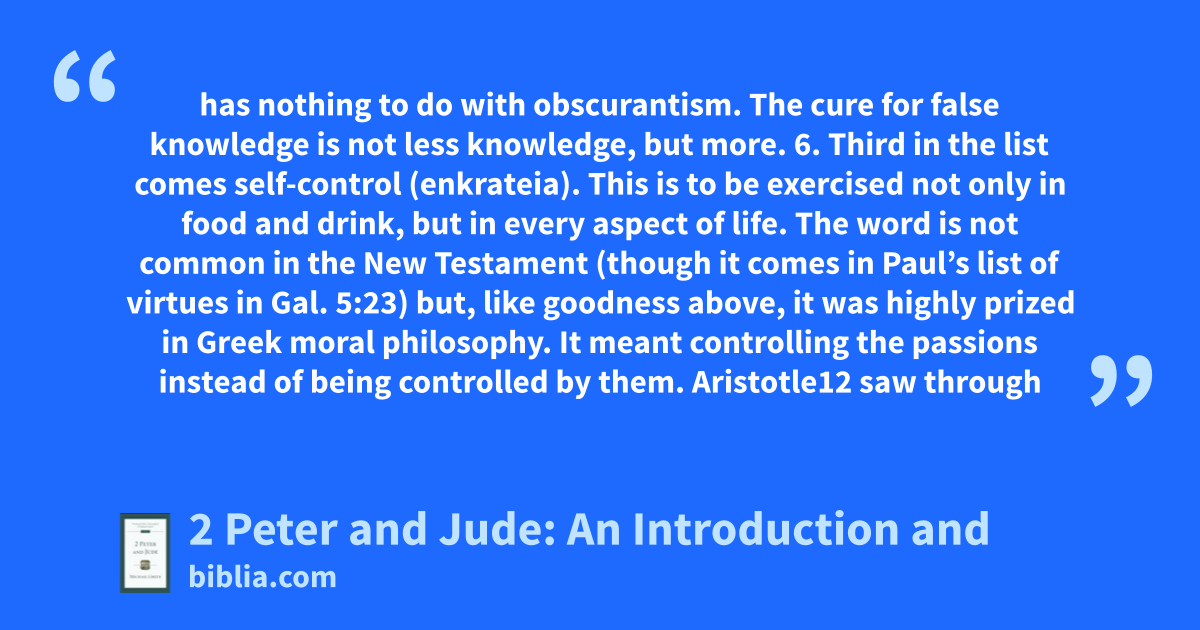 has nothing to do with obscurantism. The cure for false knowledge is not less knowledge, but more. 6. Third in the list comes self-control (enkrateia). This is to be exercised not only in food and drink, but in every aspect of life. The word is not common in the New Testament (though it comes in Paul’s list of virtues in Gal. 5:23) but, like goodness above, it was highly prized in Greek moral philosophy. It meant controlling the passions instead of being controlled by them. Aristotle12 saw through