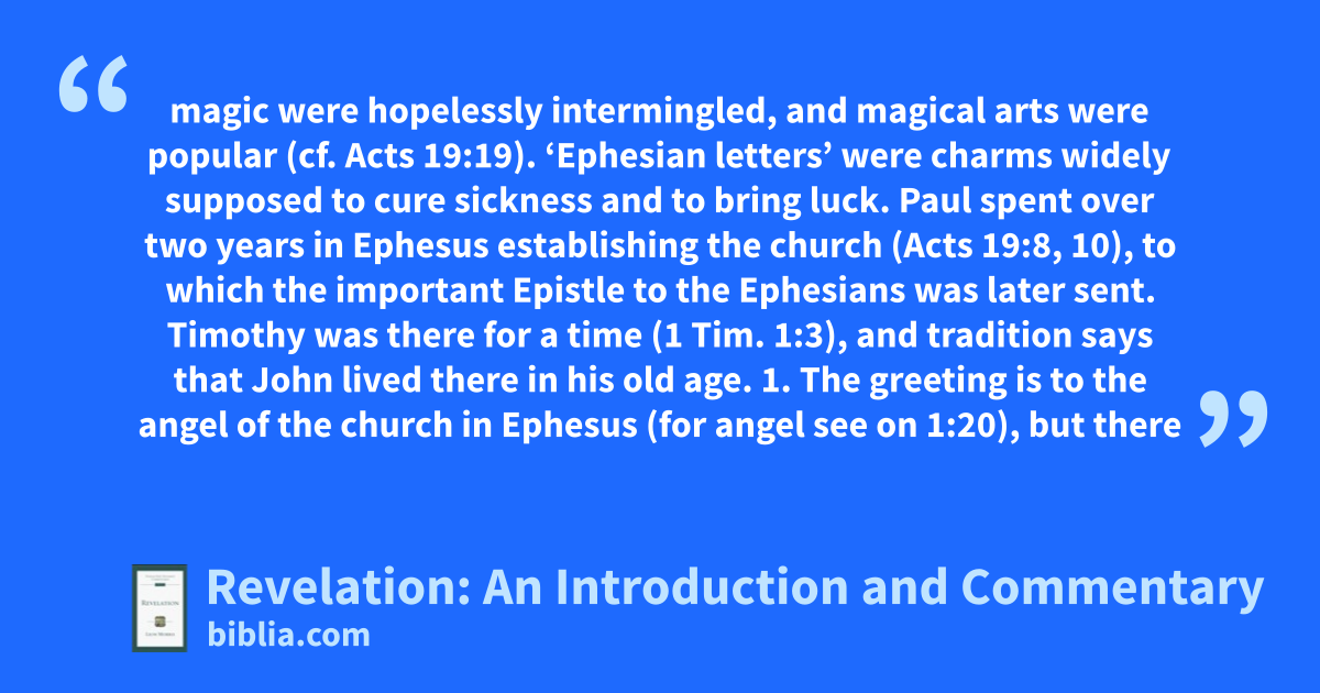 magic were hopelessly intermingled, and magical arts were popular (cf. Acts 19:19). ‘Ephesian letters’ were charms widely supposed to cure sickness and to bring luck. Paul spent over two years in Ephesus establishing the church (Acts 19:8, 10), to which the important Epistle to the Ephesians was later sent. Timothy was there for a time (1 Tim. 1:3), and tradition says that John lived there in his old age. 1. The greeting is to the angel of the church in Ephesus (for angel see on 1:20), but there
