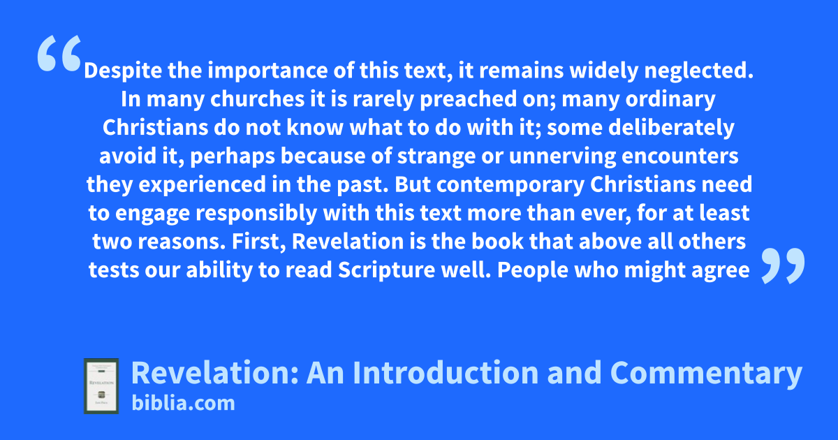 Despite the importance of this text, it remains widely neglected. In many churches it is rarely preached on; many ordinary Christians do not know what to do with it; some deliberately avoid it, perhaps because of strange or unnerving encounters they experienced in the past. But contemporary Christians need to engage responsibly with this text more than ever, for at least two reasons. First, Revelation is the book that above all others tests our ability to read Scripture well. People who might agree