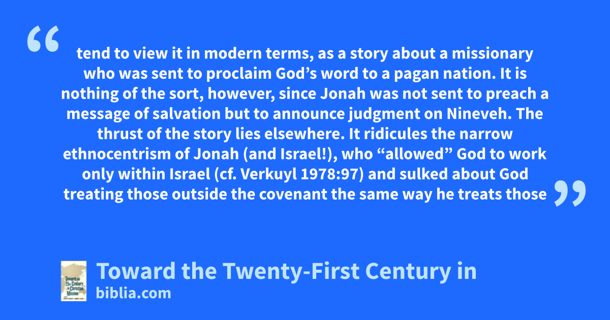 tend to view it in modern terms, as a story about a missionary who was sent to proclaim God’s word to a pagan nation. It is nothing of the sort, however, since Jonah was not sent to preach a message of salvation but to announce judgment on Nineveh. The thrust of the story lies elsewhere. It ridicules the narrow ethnocentrism of Jonah (and Israel!), who “allowed” God to work only within Israel (cf. Verkuyl 1978:97) and sulked about God treating those outside the covenant the same way he treats those