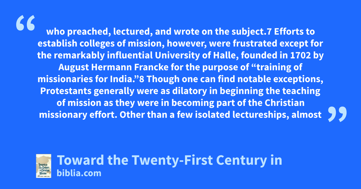 who preached, lectured, and wrote on the subject.7 Efforts to establish colleges of mission, however, were frustrated except for the remarkably influential University of Halle, founded in 1702 by August Hermann Francke for the purpose of “training of missionaries for India.”8 Though one can find notable exceptions, Protestants generally were as dilatory in beginning the teaching of mission as they were in becoming part of the Christian missionary effort. Other than a few isolated lectureships, almost